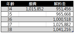 表一節錄自一個終身壽險的建議書,繳費是在34歲的年初,可是解約金的計算時間點是年尾。例如第1列的34歲,當年初繳費101萬5,852元,若是當年底解約,只剩95萬1,456元。所以用IRR計算時,若每一期都以年底為準,34歲的年初就是33歲的年底,所以現金流量的描述必須將繳款的金額往上挪一個儲存格才正確。圖五是該壽險前五年的現金流量圖,而圖六則是該壽險前五年的投資報酬率計算公式。