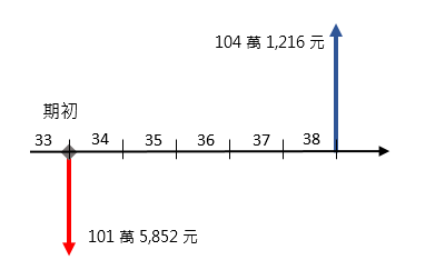 圖三是例二的現金流量,這當圖跟例一非常類似,除了期初多了一筆10萬元的投資,以及期末淨值變更外,其他沒有多大改變。現金流量仍然是6期,但是第1期期初多了一筆10萬元。第1期總共有兩筆現金流量,期初的負10萬元以及期末的負1萬元,所以無法直接相加。