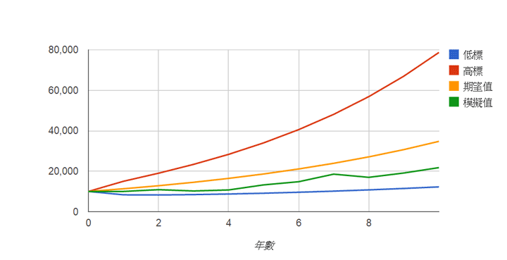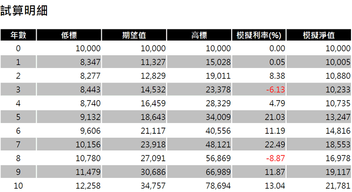但如果運氣很好,第1年的淨值有機會上看1萬5,028元,第10年也有可能達到7萬8,694。這張表的解讀是大部分的機會落於高、低標之間,例如到第三年時期末淨值有95%機會在8,443跟2萬3,378之間,至於會是多少沒有人知道。