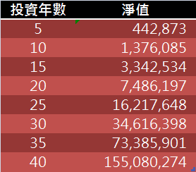 有這些觀念,再來看表一的淨值,不難發現從第15年起,幾乎都是每5年翻一倍上去。第20年到40年,總共有4個5年,可以算算是相差16倍,也就是2的4次方倍。