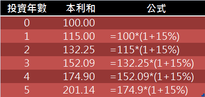 表二:100元、15%經過5年複利過程