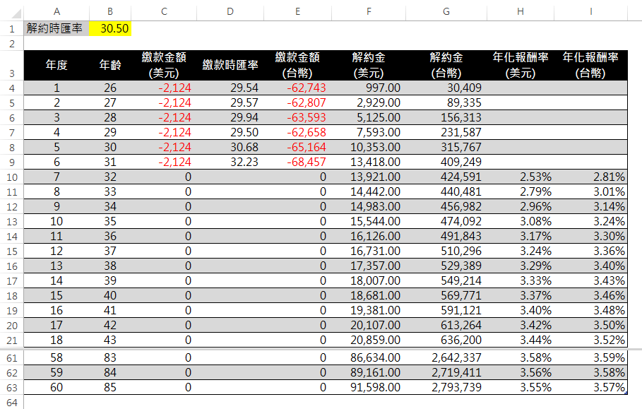 以後每一年依此類推。然而這是美元終身壽險,保費及解約金都是以美元計價,對使用台幣的保護而言,還得評估台幣的投資報酬率才算完整。所以試算表除了計算美元報酬率之外,還得加計台幣的報酬率。儲存格B1就是讓使用者自行填入贖回時的匯率,試算表會自行將美元解約金以這匯率換算成台幣解約金。