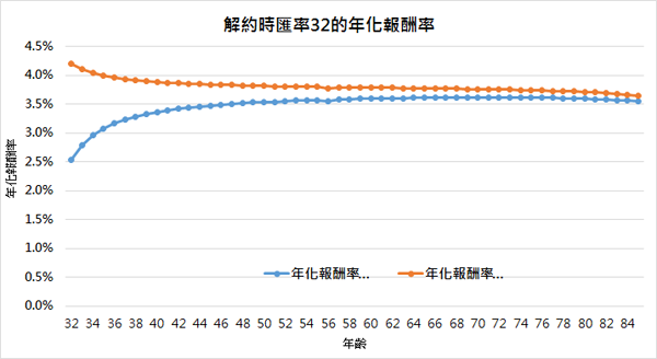 一張保單除了保障之外還有儲蓄功能,既然談儲蓄就得看投資報酬率如何了。這張保單繳費期滿保戶32歲,之後假設32歲解約,然後計算該年解約的報酬率。再假設33歲解約,計算該年解約的報酬率。依此類推算出每年解約的投資報酬率。反正Excel的計算能力非常強大,不費吹灰之力立即算出每一年解約的投資報酬率。