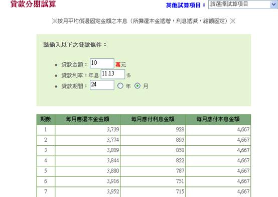 如果借10萬元24期,年利率11.13%,每月繳交本息4,667元。