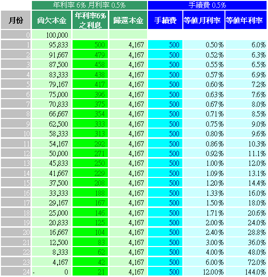 下表左邊綠色部分是年息6%(月息0.5%)的本金平均攤還表,可以看出除了第一個月的利息是500元外,其他月份是愈來愈低的。可是如果用手續費的名義,當然才有理由全部每月都收500元。就是因為這樣算出來的年利率才會那麼高。