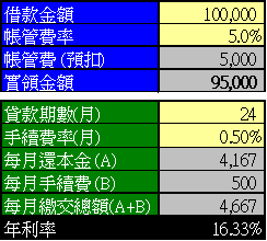 就可以說10萬元24期,手續費率每月0.5%等同於年利率11.13%。