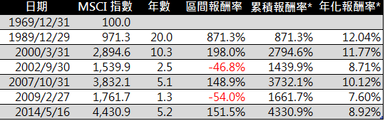 當然不能只看跌的部分,再看看漲幅就會有信心了,從西元1969至1989年20年間從100點漲到971點,累積報酬率高達871%,相當於每年以12.0%成長。再看看最近20多年來的情形,從1989年底至2000年3月底,這10年3個月總共漲了198%。從2002年9月底低點開始起漲,至2007年10月的金融海嘯高點,只有5年也漲了149%。2009年2月的金融海嘯低點至今2014年5月,這5年也漲了151%。下表是該指數的漲跌時間及績效: