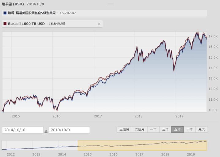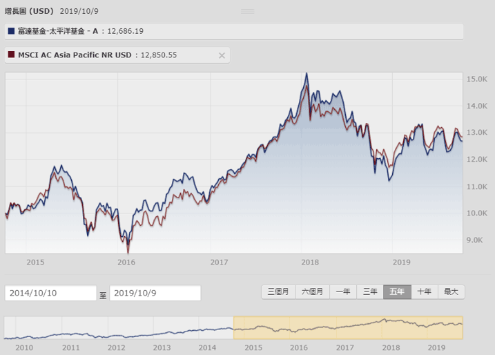 圖一就是聯博美國股票基金近5年(2014/10/10~2019/10/9)的績效,藍色線條為基金績效,紅色線條就是Russell 1000指數,可以看出來基金幾乎貼著指數走。圖二是富達太平洋基金的績效圖,走勢也跟摩根史坦利太平洋指數(MSCI AC Asia Pacific NR)非常接近。
