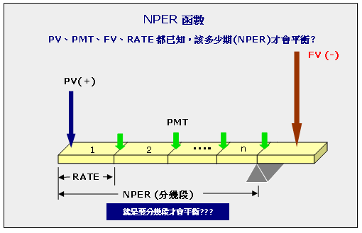 有了這些基本觀念,接下來就簡單了。NPER函數就是傳回:已知的利率(RATE)的情況下,多少『期』會使得PV、PMT及FV相互得到平衡。
