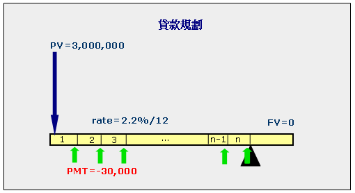 以這例子每月為一期,PV=3,000,000,RATE =2.2%/12,PMT=-30000,FV