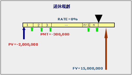 以這例子每年為一期,PV=-2,000,000,PMT=-300,000,RATE