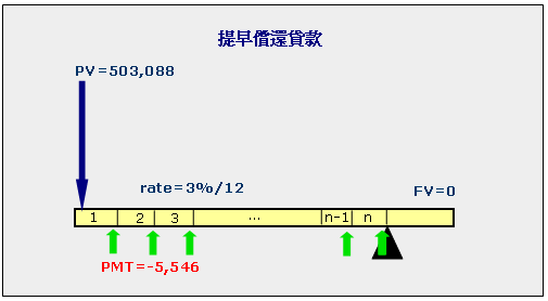 以這例子每月為一期,目前本金還有503,088(PV=803,088-300,000),年利率3%(RATE=3%/12),每期繳款5,546(PMT=-5,546),期末還清(FV