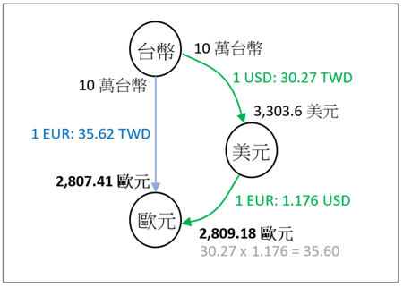 圖二:台幣直接換歐元,或先換美元再轉歐元,結果都一樣