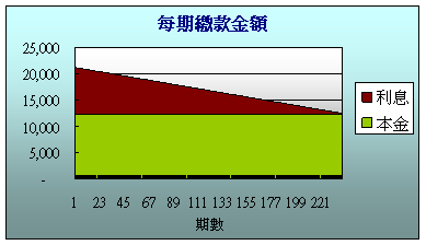 本息平均攤還又稱本息定額償還,意思是每個月繳款金額是固定不變的,亦就是說每期支付的利息及本金加起來的總額都是一樣的。但是因為每月都有償還部分本金,所以利息會每期遞減。既然利息每期遞減,而繳款金額不變,所以償還本金的比例就愈多。這種方法你會發現貸款前期大部分都在繳利息,償還本金的部份比較少。到了後期因為貸款餘額愈來愈少,利息當然也愈來愈少,所以後期裡每月所繳金額裡,本金比例就佔了大部分如下圖一所示。
