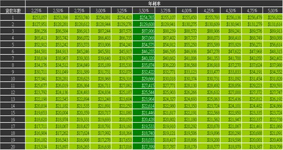 圖四是以年利率3.5%,貸款金額$3,000,000來計算所計算出來的。深綠色那欄是年利率3.5%的結果,左右兩邊淺綠色欄位為3.5%附近的利率(由解析度來決定每一欄位年利率的間隔有多大),方便了解升息或降息時會有何影響。