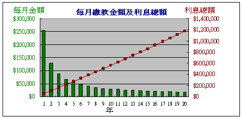 由圖五可以看出隨著貸款年限的增加,每月攤還的金額會大幅減少。這種結果讓貸款者得以把貸款年限增加,來減低每月攤還的金額,所以才還得起貸款。但是相對的貸款年限增加,帶來的卻是利息的支付愈高。如何在這當中取得一個平衡點,就是必須折衷的地方。由圖中可以看出由貸款一年增加到六年,每月繳款金額會快速從25萬元降到5萬元,到了第九年以後似乎減少的金額有限,可是利息總額卻呈直線增加。這似乎在告訴我們每月若能撐一下,每月多繳一點讓貸款金額,是可以縮短不少貸款年度,年數一減少,是可以省相當的利息。
