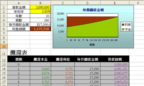 Excel的PMT函數可用來計算每月繳款金額。=PMT(年利率/12, 期數, 貸款金額)。雖然每月攤還金額和貸款金額、貸款年利率及貸款期限相關,但是通常貸款年利率於某一時期每家銀行都差不多的,例如以2007年初來看,大部分銀行的房屋貸款利率約3.5%上下。至於貸款金額也都大致底定,因為一般是已經有中意的房子,需要貸多少錢都已經很明確。剩下的問題就是要貸多久了。