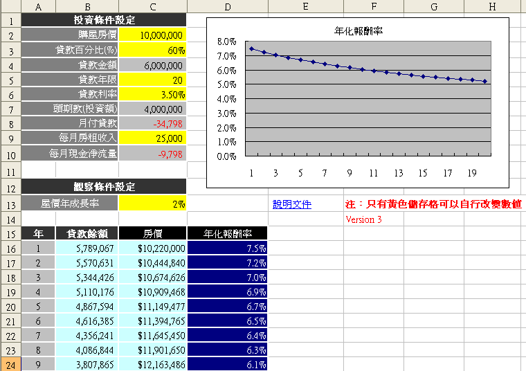 當房屋售出時,淨所得必須將售出屋款扣除房屋『貸款餘額』。當讀者把投資條件設定完後,只需要再輸入“屋價年成長率”就可以觀看結果了。