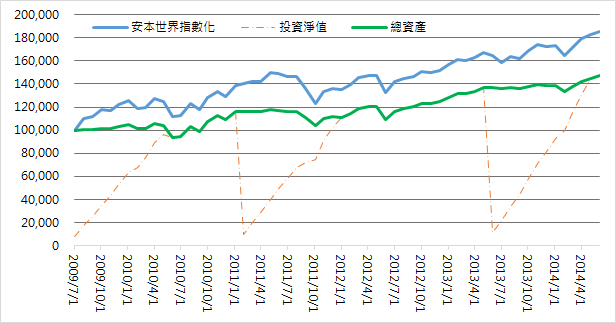 用數據來看最更清楚了,以安本世界基金A2(美元)為例,只要比較一下停利與不停利的結果就知道了。下圖是該基金從2009/7/1至2014/6/2日的基金淨值。先看不停利的結果,以單筆買進持有方式進場,如果投資金額為10萬美元,假設購買基金的手續費3%打六折1.8%,實際購入基金的金額只有9萬8,200.00美元【=100000*(1-1.8%)】,2009/7/1的淨值為10.330美元,所以購入單位數9,506.292。到了期末(2014/6/2)的淨值為19.175美元,總淨值為18萬2,286.96,累積報酬率為82.3%【=182286.96/100000-1】,年化報酬率為13.0%【=EFFECT(((1+82.3%)^(1/59)-1)*12,12)】。