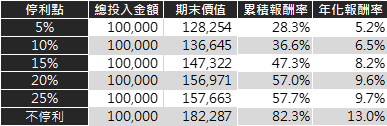 如果投資獲利5%就停利的話,累積報酬只有28.3%。若獲利15%就停利,累積報酬也只有47.3%。試算結果明顯告訴我們,停利點愈低,停利次數就愈頻繁,成本也會愈墊愈高,最後造成投資報酬率減少。這結果得到一個結論,如果基金績效長期趨勢往上,停利只會使得獲利減損。獲利了結再分批定期定額進場,只是讓心理暫時覺得落袋為安,但卻得用投資報酬率來換取,值得嗎?