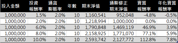 下表列出了不同的投資報酬率,在投資金額為100萬、通貨膨脹率2.0%的條件下,詳細的計算明細。