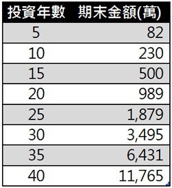 表一的第1列是每月投入1萬元於報酬率12%的基金,經過5年後期末淨值為82萬元。可是表一的最後5年(35~40年),同樣是5年期間,投資報酬率及每月投入金額都沒有變的情況下,卻從6,431萬成長到1億1,765萬,5年內足足增加了5,334萬。