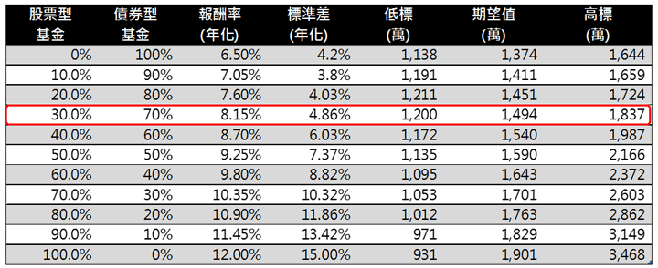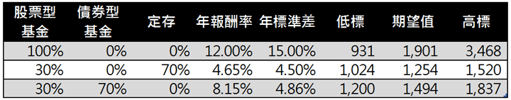 表三是上述三種組合的投資報酬率及標準差,全部都投資股票型基金的期望值最高1,901萬,但是淨值波動也相對大許多。第二列及第三列波動較大的股票型基金都是持有30%,另外70%一個是投資定存,另一個投資債券型基金,可以看到股票型/定存的組合,報酬率明顯的被拉下到4.65%,而標準差也下降至4.5%。而第三列股/債的組合,報酬率提升至8.15%,但標準差卻只高了一點點4.86%。