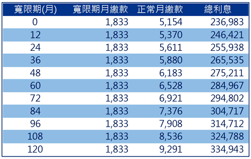 下表是100萬貸款,年利率2.2%,於不同寬限期下之月繳款(寬限期及正常)及總利息,可以看出寬限期愈長,總利息愈多,過了寬限期以後的每期繳款金額也增加了。結論是,想要省下利息就不要寬限期,如果資金才是重點,寬限期就愈長愈好,只是得要付出代價。