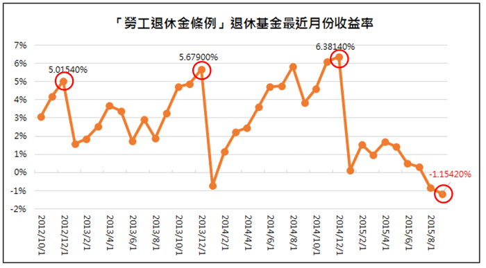 勞動部退休基金最近3年的月投資績效都會上網公告。今年至9月底的收益率為-1.1542% (104/11/2公告),也就是今年到9月是虧損的。如果仔細看每個月的績效,一開始還讓我嚇了一跳,每月績效都有好幾趴,一年下來的報酬率可是兩位數了,那麼高的報酬率難道不擔心波動風險嗎?