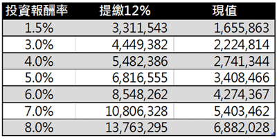 表二:月平均薪資5萬元,每月提繳薪資12%的條件下,35年後的期末帳戶餘額,及通膨2%的現在價值