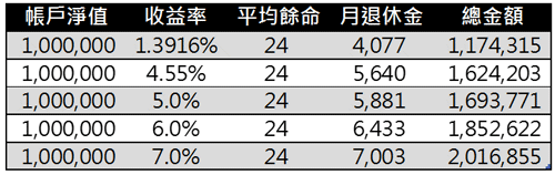 表三:不同的收益率可領到的每月退休金,以及至平均餘命可領到的總金額