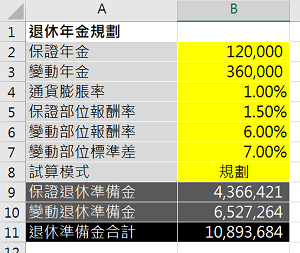 將固定部位退休金投資定存,就可以保證未來一定可以領到,但是因為報酬率很低,退休準備的金額就會較高。而變動部位的退休準備因為具有彈性,就可以投入較積極的商品,因為報酬率較高,相同的年金支出所須準備的金額也就較少。