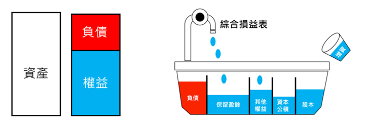 想要弄懂權益變動表,就得先了解綜合損益表以及資產負債表之間的關係,再看權益變動表在當中扮演的角色。圖一左邊是資產負債表,資產包含了所有企業經營的資源,右邊的負債及權益則敘述資金來源,扣除掉負債部分當然就是業主所擁有的權益,又稱為淨值(Book Value)。其實,資產負債表的資金來源也可以看成是一個浴缸,而綜合損益表又可看成是水龍頭,將營運淨利挹注進來。當期淨利注入愈多,業主權益就會愈多,若當期是虧損就會讓業主權益減少,所以圖一浴缸藍色的水就代表著權益。