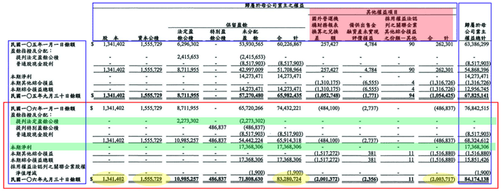 提列法定盈餘公積這個事件(淺綠色底),從未分配盈餘會計科目挪出了22億7,330萬元至法定盈餘公積科目,只是從一個科目移轉至另一個科目,所以最右邊欄位的權益合計為0,代表對整體權益沒有影響。而本期淨利(淺綠色底)讓未分配盈餘增加了173億6,831萬元,而且只有影響這個科目,所以權益合計增加了173億6,831萬元。也就是說,最右邊的權益合計欄位為0就代表內部互相移轉,實際每有影響到業主權益,投資者所關心是那些會造成總權益變動的事件。