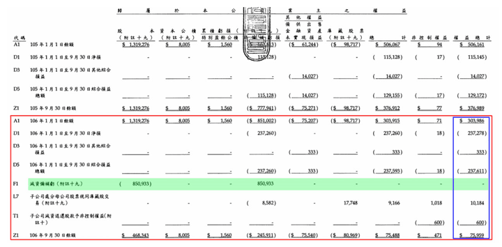 首先看股市模範生大立光(3008)的權益變動表是什麼樣子(圖二),紅色方框內是106年度第1季至第3季的權益變化,上方則是105年度同期間的變化。左邊藍色方框是影響權益變動的事件,上方藍色方框則是權益的會計科目,分為主要會計科目及其他權益項目(紅色底)兩大類,欄列交叉點就是該事件所影響的會計科目,而最右邊欄位(藍色框)則是每一事件對整體權益的合計。106年初至第3季為止,大立光的權益變動事件只有提列法定盈餘公積、提列特別盈餘公積、配發普通股股利、本期淨利、本期其他綜合損益以及採用權益法認列之關聯企業股權淨值增減等共六項。