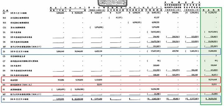 例如圖一的陽明海運(2609),雖然105年底股本還有300億4,401萬元,但是待彌補虧損已經高達176億5,711萬元,總權益158億884萬元,每股淨值只剩5.3元,當時的股價也只有4.68元。萬一持續虧損下去造成淨值低於5元,就會被打入全額交割股。於是106年第一季就減資160億498.8萬元(圖一F1代碼),等於每千股減少532.71115股,之後再以每股10.48元私募了1億6,133萬股,同年又以每股12元增資了6億股,所以到了106年底股本回到了232億3,025萬元(23億2,303萬股),期末總權益260億3357萬元(圖一Z1代碼),淨值回升到11.2元。