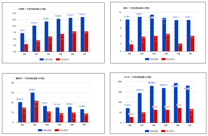 較高的市值除了股價獲得肯定之外,企業規模也相對比較大,也較具備競爭優勢。圖一列出了市值前4大公司近年來的每股盈餘,可以看出獲利及配息都非常穩定,才會獲得市場青睞。存股就是長期投資,首重獲利的穩定度,沒了獲利就不會有配息,持有期間愈長就愈不利。一個很有趣的現象是獲利衰退了,市場價值就會往下掉,除非投資者都非理性,否則獲利較穩定的公司,獲得市場的回報就愈大。